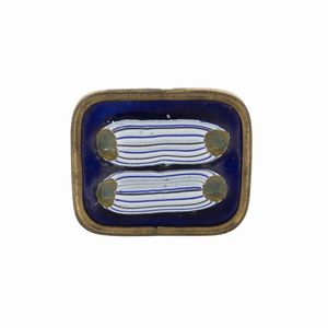 in metallo dorato, smalti policromi ed ecopelle, lunghezza 7 cm.