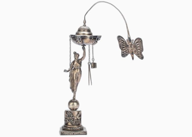 La selezione include inoltre opere italiane, tra le quali segnaliamo una lucerna romana del 1820, con figura di vestale centrale poggiante su sfera cesellata a tutto tondo che sorregge una lucerna a quattro luci con paralume terminante con una ventolina sbalzata a farfalla. Il suo valore è di 800 / 1.000 euro.