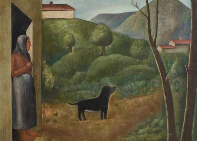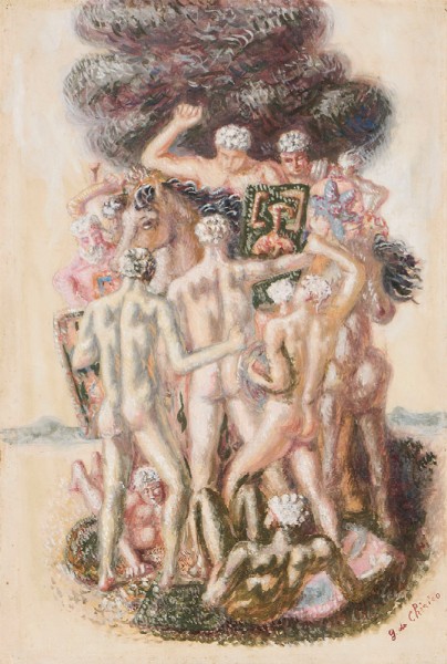 Un decennio più tardi, Giorgio Morandi firma Paesaggio (1940-41), stimato 300.000–380.000 euro e proveniente dalla collezione privata di Ardengo Soffici. L’opera, che raffigura le campagne di Grizzana, restituisce con sobrietà e misura cromatica l’essenza visiva del maestro bolognese, fatta di ritmi lenti e tonalità terrose. Dalla stessa collezione arriva Lotta di guerrieri antichi di Giorgio de Chirico (100.000–140.000 euro), una tempera appartenente al ciclo dei Gladiatori: soldati in posa sospesa, che sembrano più attori in scena che veri combattenti, immersi in uno spazio senza tempo, carico di echi classici e atmosfere sospese.