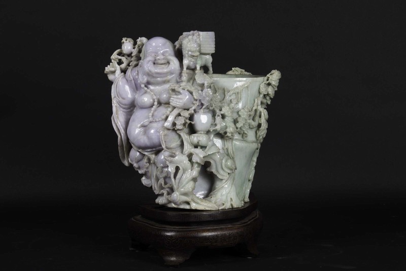 Tra i lotti di maggior rilievo spicca un importante corallo rosso scolpito, straordinario esempio della maestria artigianale cinese del XIX secolo sotto la Dinastia Qing. L’opera, che raffigura Guanyin circondata da fanciulle e vegetazione, arricchita da iscrizioni, si impone come simbolo di raffinatezza artistica ed è presentata in catalogo con una stima di 70.000 – 100.000 euro. Accanto ad esso, un portapennelli in giadeite dalle delicate sfumature verde mela e lavanda, decorato con la figura di Budai e motivi di bamboo, realizzato in Cina durante la Repubblica nel XX secolo e stimato 8.000 – 12.000 euro, testimonianza della continuità della tradizione lapidaria asiatica.