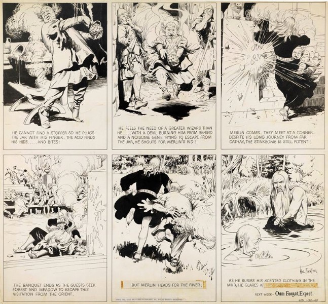 Tra i lotti di maggiore rilievo figurano anche le tavole avventurose di Hal Foster per Prince Valiant, capolavoro assoluto del fumetto realistico. Particolarmente ambita è la tavola “Prince Valiant - Ah! Women!” del 1970 (stima 8.000 / 12.000 euro), che condensa in una sola pagina tutta la maestria del disegnatore nel trattare anatomie, paesaggi e dettagli decorativi con una raffinatezza quasi pittorica. Dello stesso autore è proposta anche la tavola “Prince Valiant - Black Magic in Wales” del 1949 (stima 5.000 / 7.000 euro), in cui la componente epico-fantastica si intreccia a un segno solido e monumentale.