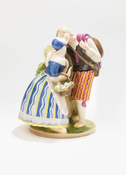 Tra le ceramiche policrome della celebre manifattura Lenci spicca "Primo bacio" (1930) di Giovanni Grande, opera emblematica per la sua grazia formale e delicatezza cromatica.