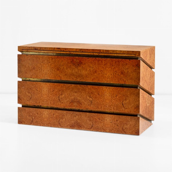 Tra gli oggetti protagonisti e più richiesti di questo appuntamento, spicca l’iconico mobile contenitore-scrittoio di Gabriella Crespi “Monsieur et Madame”, datato 1972, in struttura in legno e radica e dettagli in ottone, con marchio originale e firma incussa.