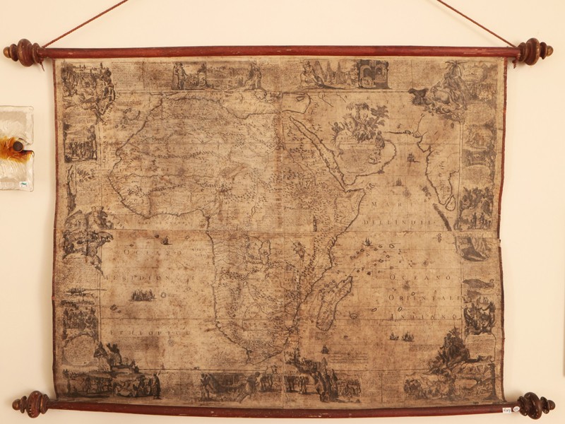 L’attenzione si rivolge ora a l'incisione de l'Africa dedicata all'Illustrissimo Principe Carmine Niccolò Caracciolo, opera realizzata nel Settecento da Paolo Pertini su rame, applicata a tela e montata su sostegni in legno in epoca coeva all'edizione (lotti 55, stima € 500-600).