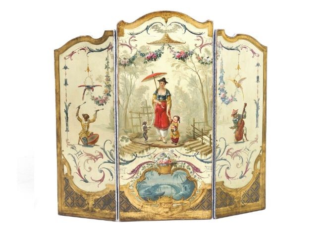 Completa l'offerta un parascintille a tre ante sagomate in tela dipinta a olio, risalente anch’esso al XVIII secolo, testimonianza di un gusto decorativo ricercato e funzionale (valore 1.400-1.600 euro).