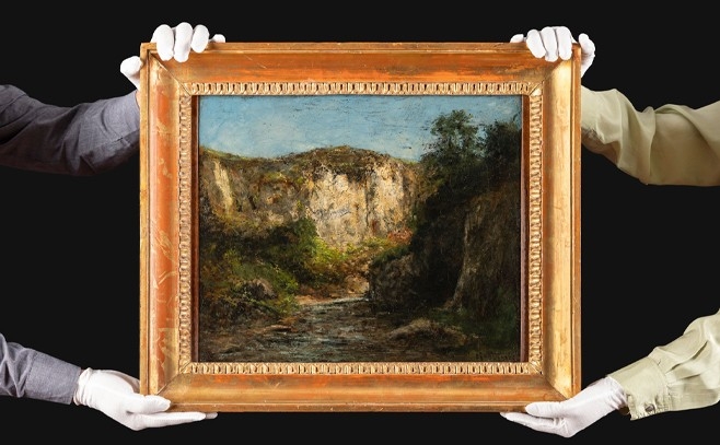 Rochers d’Ornans” risiede in una diagonale che divide il dipinto: da un lato l’ombra che avvolge la materia e dall’altro la luce che evidenzia una gamma cromatica di rosso, blu, viola e verde. Questo dipinto sarà in asta il prossimo 11 dicembre a Milano all’interno del catalogo di