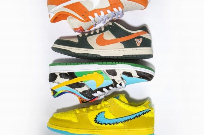 Gli articoli in asta da Finarte sono 63, sono tutti nuovi di fabbrica e provengono tutti da una collezione privata, dalle iconiche Dunk alle leggendarie Air Jordan. “Sneakershead” è stata organizzata in collaborazione con Big Soup, primo reseller in Italia ad aprire uno store fisico e che oggi vuole tentare di seguire un trend internazionale ormai avviato; lo dimostrano alcune importanti aste passate, come quelle organizzate da Christie’s e da Sotheby’s, in cui un singolo paio di sneakers è stato venduto intorno ai 400 mila euro. Protagonista dell’evento del primo giugno è sicuramente il top lot Nike Dunk SB Low Pro “Paris” Bernard Buffett, taglia 44, sneakers stimata tra gli 80 e i 90 mila euro. Il modello, realizzato per la mostra “White Dunk” di Parigi, riprende, nella grafica, alcune opere del pittore espressionista Bernard Buffett, il che le rende uniche nel loro genere.