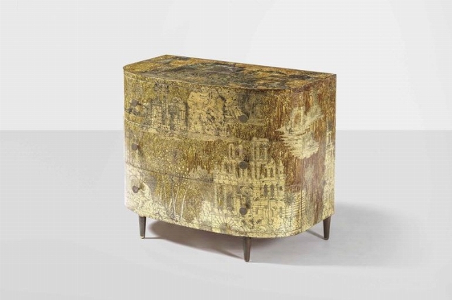 In prima fila troviamo due versioni di cassettone firmate Piero Fornasetti. Due mobili unici nel loro genere, con una struttura in legno laccato e serigrafato con decoro Gran Coromandel, con una particolare attenzione alla composizione dei dettagli, come i pomelli e i sostegni, entrambi in ottone. I due complementi d’arredo provengono da una collezione privata di Montecarlo e la loro produzione risale al 1950 circa.