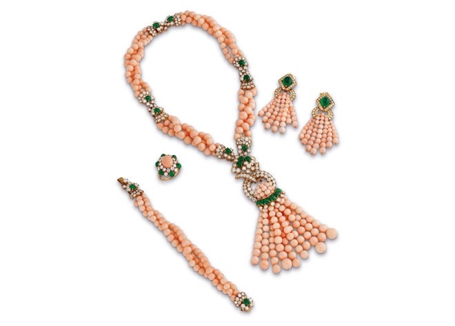 Figura discreta ma fondamentale nel panorama orafo francese del Novecento, André Vassort è uno di quei maestri artigiani rimasti a lungo nell’ombra delle grandi Maison parigine di Place Vendôme. Eppure, il suo atelier era tra i più stimati e richiesti dell’epoca: Van Cleef & Arpels, Boucheron, Mauboussin e Louis Gérard si rivolgevano a lui per realizzazioni di altissima qualità. Proprio da questa collaborazione con Gérard nasce la sontuosa parure con corallo rosa, smeraldi e diamanti che guida l’asta fiorentina con una stima compresa tra i 60.000 e i 90.000 euro. Forgiata in oro giallo 18 carati, la parure comprende un soutoir, un bracciale, un anello e un paio di orecchini pendenti. La collana è modulabile: la parte finale può essere rimossa e indossata come spilla. I pendenti, a forma di nappa, sono composti da fili di boules in corallo, mentre smeraldi cabochon per circa 18 carati e diamanti taglio brillante per circa 37 carati impreziosiscono l’intera composizione.